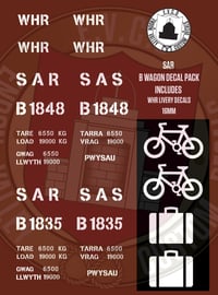 This pack includes enough decals for 2 B wagons in SAR or WHR livery .